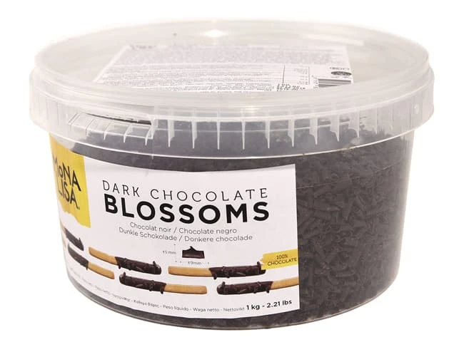 Boîte de mini-copeaux de chocolat noir 48% cacao min, pour la décoration des desserts et entremets à base de chocolat.